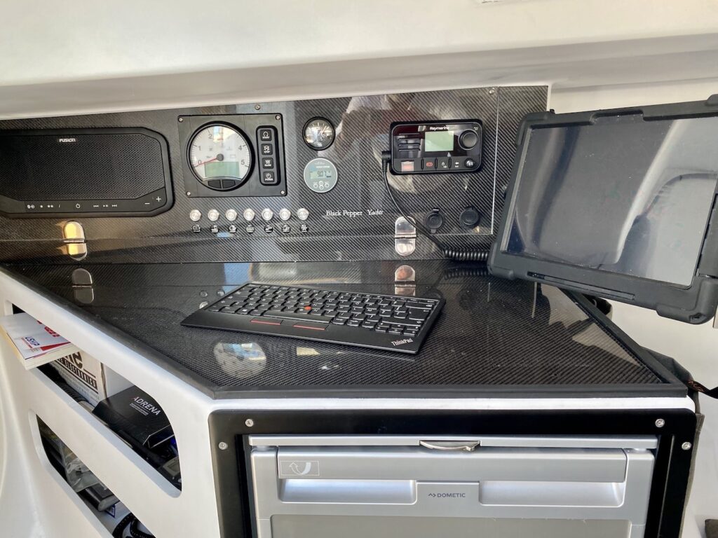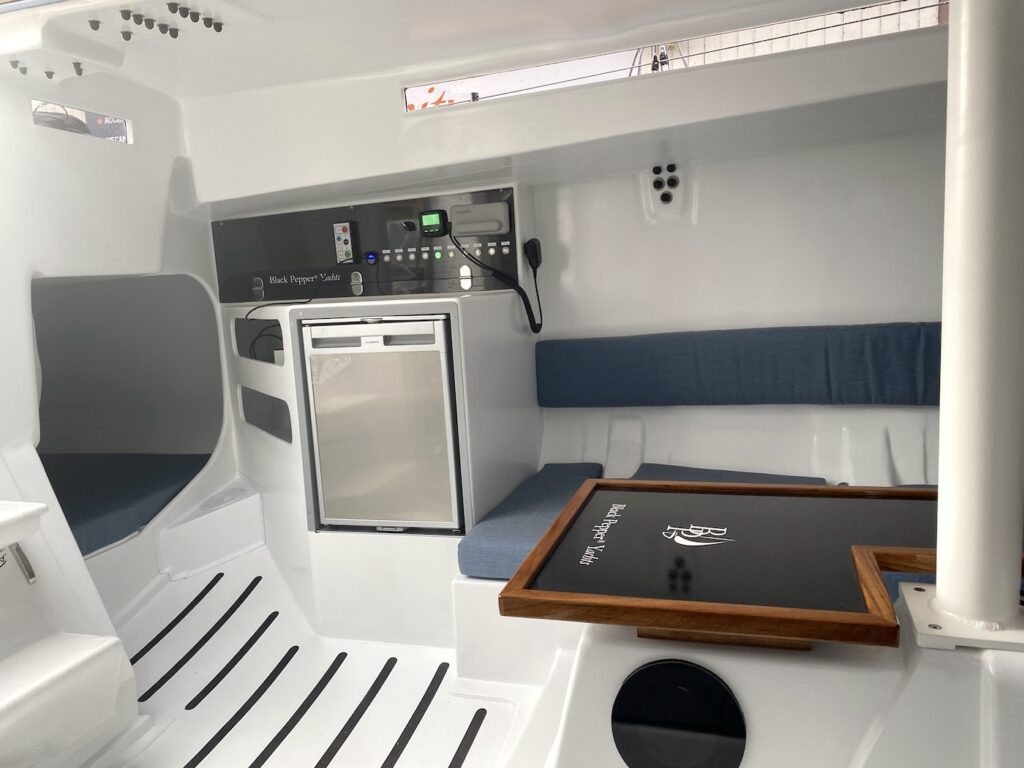 Concernant la motorisation, le voilier embarque de série un bloc diesel de 14 chevaux sur transmission par ligne d’arbre ou Saildrive. Pour répondre aux nouvelles attentes écologiques des plaisanciers, Black Pepper propose également un système de propulsion entièrement électrique alimenté par un parc de batteries dédié, permettant des manœuvres portuaires fluides, silencieuses et sans la moindre émission polluante.