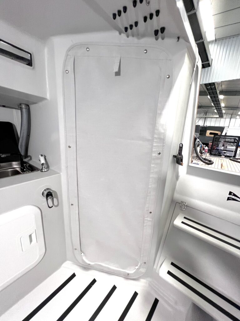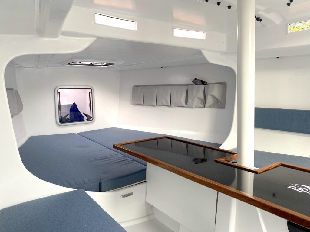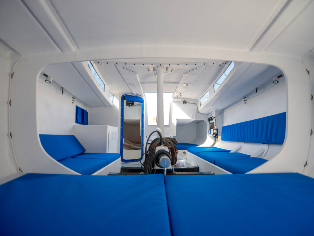 Malgré son profil très affûté de dayboat, le Code 0.1 dévoile un volume habitable remarquable, autorisant de belles escapades prolongées. L’intérieur adopte le style néo-industriel exclusif de la marque, laissant la structure en carbone apparente tout en conservant une atmosphère chaleureuse et lumineuse. L’espace de vie central bénéficie d’une hauteur sous barrot suffisante pour envisager confortablement de courtes croisières. Entièrement modulables selon les désirs du propriétaire, les aménagements peuvent intégrer jusqu’à six couchages répartis sur trois lits doubles.
