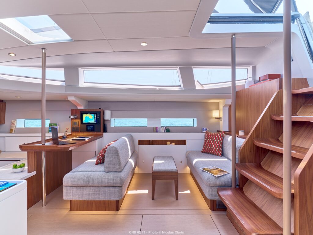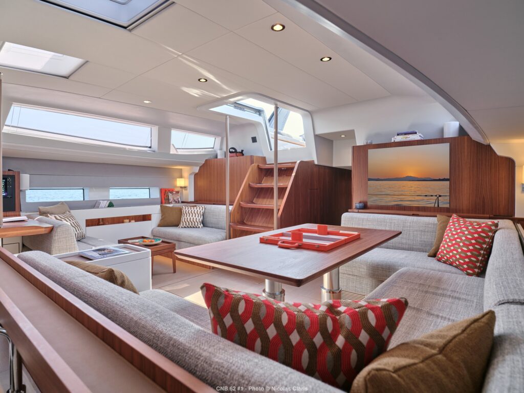Parmi les innovations conceptuelles du CNB 62 on note le déplacement des postes de barre vers l’avant, ce qui permet de libérer le cockpit et d’améliorer la visibilité du barreur. Un arceau carbone sera intégré afin de déporter l’écoute de grand-voile hors du cockpit et de servir de support pour une capote de roof ou un bimini selon les options. Le cockpit arrière comprendra une grande zone de détente, une plateforme de bain et un garage longitudinal pour l’annexe.