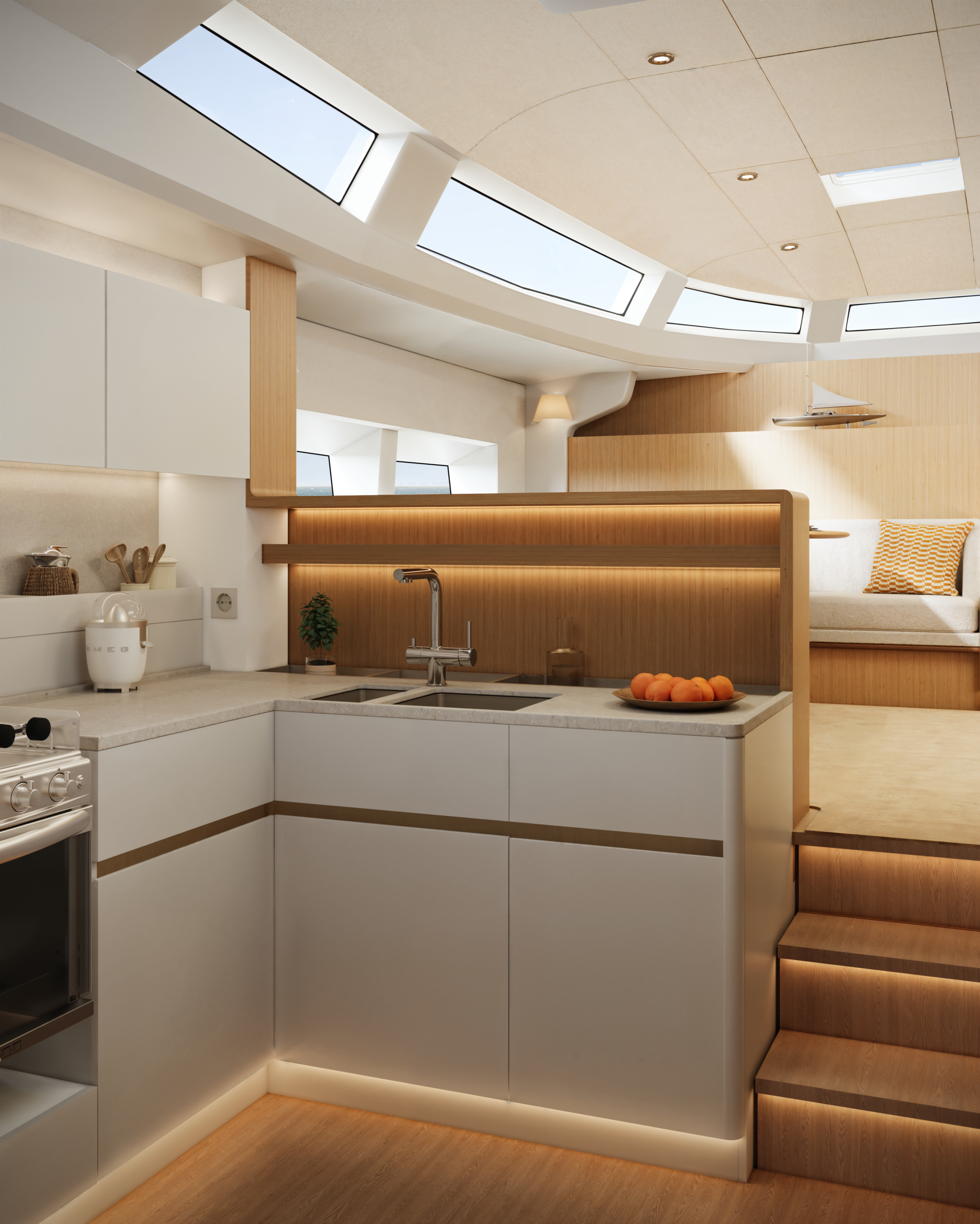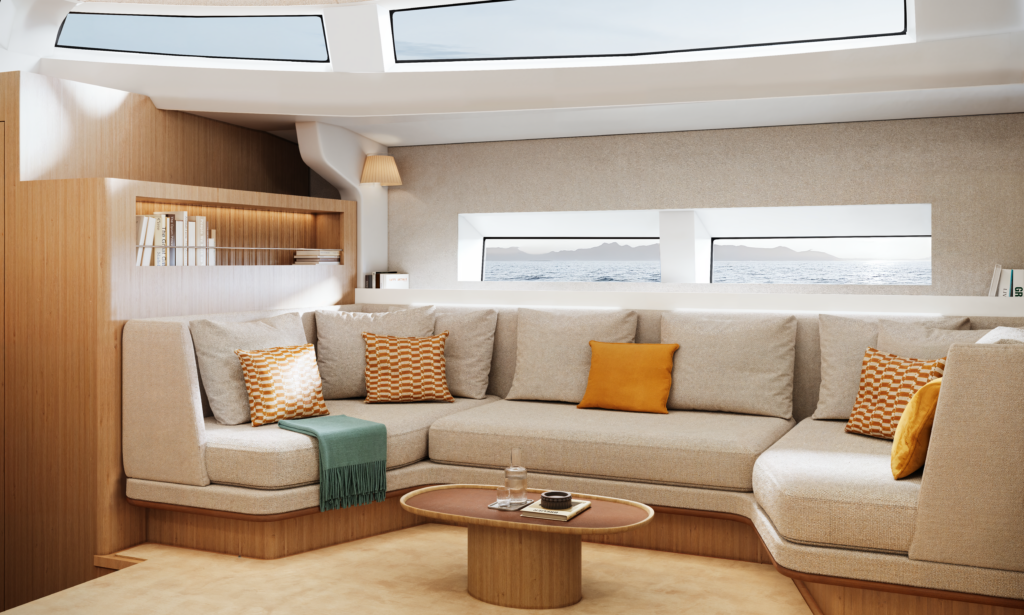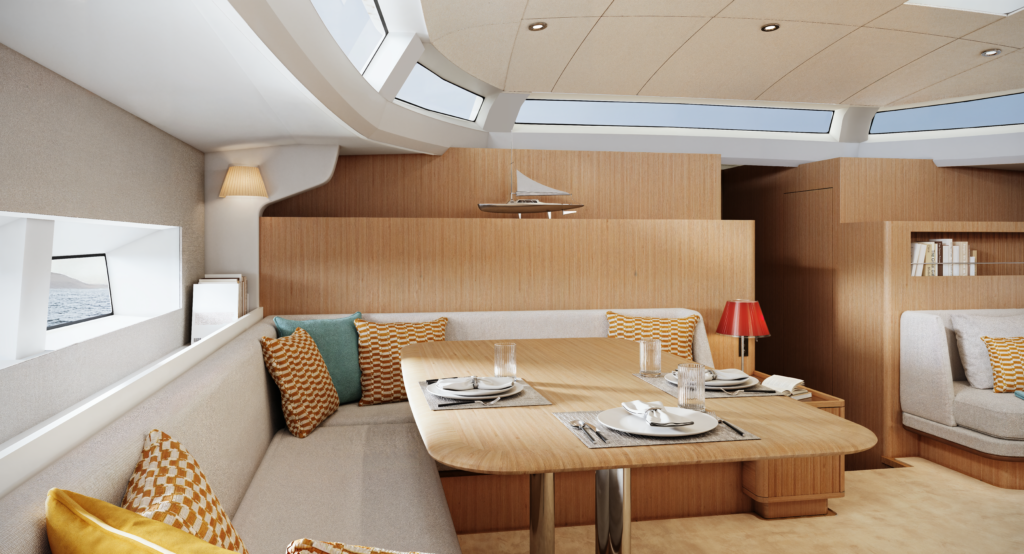 L’aménagement intérieur, confié à l’expertise de Jean-Marc Piaton, sublime le concept du roof panoramique qui a fait le succès historique des voiliers CNB. Les larges surfaces vitrées inondent le carré d’une lumière naturelle exceptionnelle tout en offrant une vue imprenable sur l’horizon, effaçant ainsi la frontière entre l’intérieur et l’extérieur. La grande innovation de ce modèle réside dans sa vaste cuisine ouverte directement sur le carré, créant un espace de vie résolument moderne, fluide et convivial. Côté nuit, le CNB 68 propose un agencement généreux et modulable pouvant aller jusqu’à quatre luxueuses cabines, dont une somptueuse suite armateur située à la proue, garantissant intimité et confort.