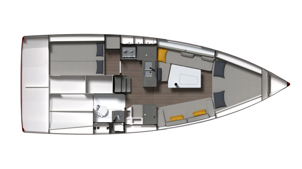 Contrairement à la tendance de plus en plus présente des doubles barres à roue sur cette taille de bateau, le chantier a opté pour une configuration à double barre franche. Ce choix technique permet de libérer visuellement l’arrière du bateau tout en offrant un retour d’information direct et précis au barreur. Ce dernier bénéficie d’ailleurs d’assises reculées et de cales-pieds intégrés pour barrer confortablement à la gîte. L’accastillage a été pensé pour la fluidité des manœuvres, avec des winchs d’écoute de génois et de gennaker positionnés de manière stratégique à l’arrière, facilement accessibles pour la navigation en équipage réduit. Une delphinière solidement intégrée facilite quant à elle l’amure des voiles d’avant (Code 0, gennaker) tout en éloignant l’ancre de l’étrave.