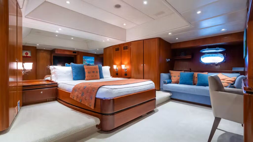 Sous le pont, le salon principal pleine largeur est lumineux et spacieux. Récemment rafraîchi par le propriétaire actuel, il dispose d’une vaste bibliothèque multimédia. À l’arrière, les espaces nuit comprennent trois cabines avec salle de bain attenante : une suite parentale pleine largeur avec douche hammam, une cabine VIP avec lit queen-size à bâbord, et une cabine invités convertible (deux lits simples ou un lit king-size) à tribord. Une quatrième cabine Pullman polyvalente peut accueillir une nounou ou servir d’espace de couchage ou de rangement supplémentaire, tandis que les quartiers équipage situés à l’avant peuvent accueillir jusqu’à cinq membres d’équipage répartis dans deux cabines.